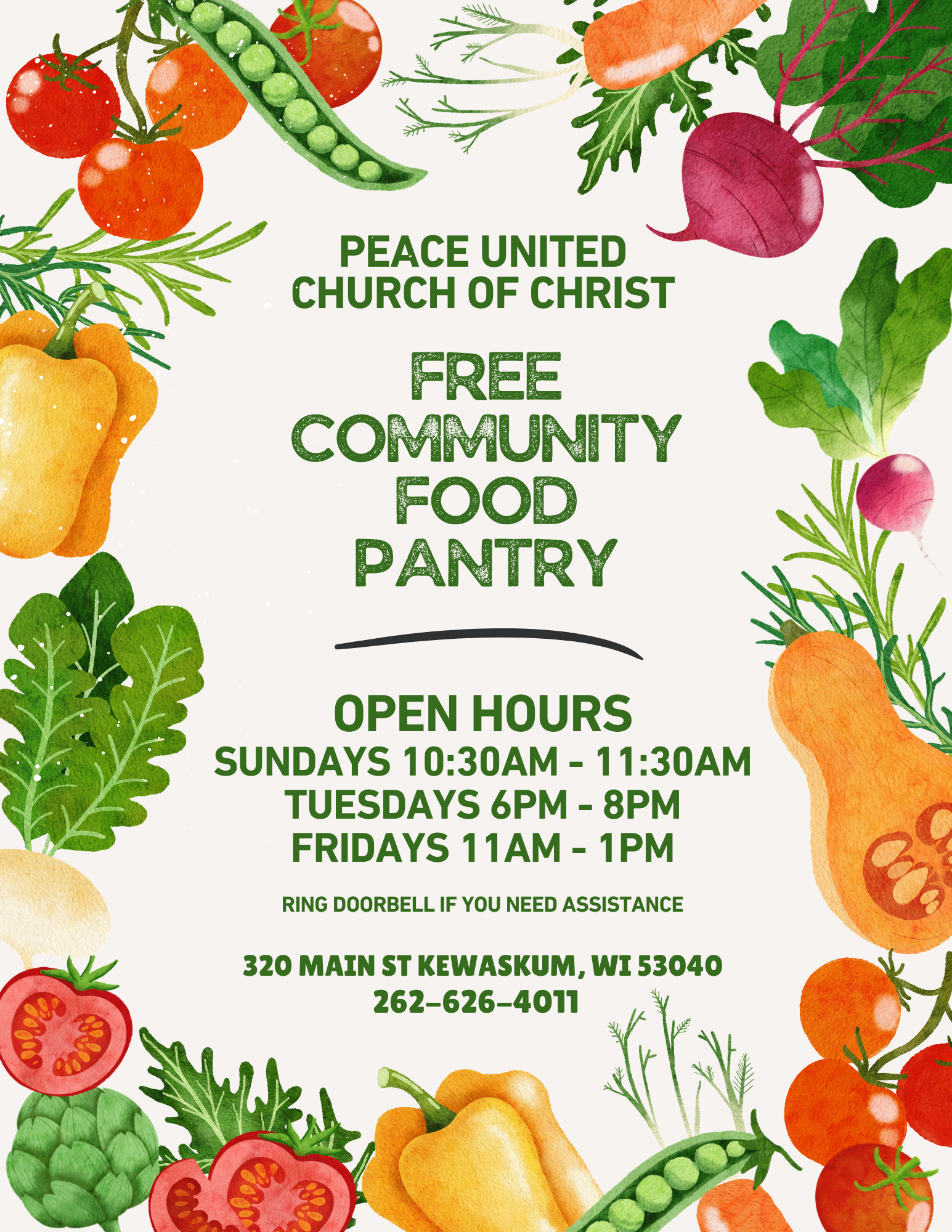 Peace Pantry – by now, many of you may have noticed the food pantry located in Peace Church’s parking lot. What you may not know is how much it is utilized by the surrounding community! The pantry gets stocked weekly, and donations are made to the pantry not only by our church members, but by members of the community as well. It has proven to be a very welcomed addition to the Kewaskum area. We will always accept non-perishable items for the pantry or cash donations to purchase items. In addition, the Peace Pantry now has open hours in the newly created Pantry inside the church. Please look for the posted hours down below. The new space has allowed us the opportunity to get a refrigerator and freezer to accommodate products like eggs, cheese. butter, meat, frozen meals, fresh fruit and vegetables. We are always in supply of popular items like toilet paper, personal hygiene products, pasta and spaghetti sauce, fruit cups, chicken noodle soup, saltine crackers, fruit snacks, goldfish crackers, peanut butter and jelly, Cheerios, Rice Krispies, pop-tarts, feminine hygiene items, and jarred baby food. We are grateful for the support of Peace Church and the community! Please call the office if you need information or assistance. 262-626-4011